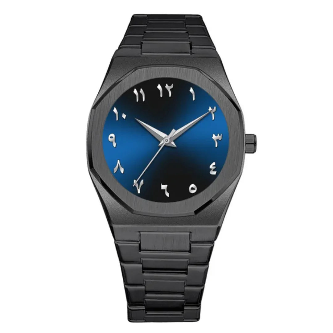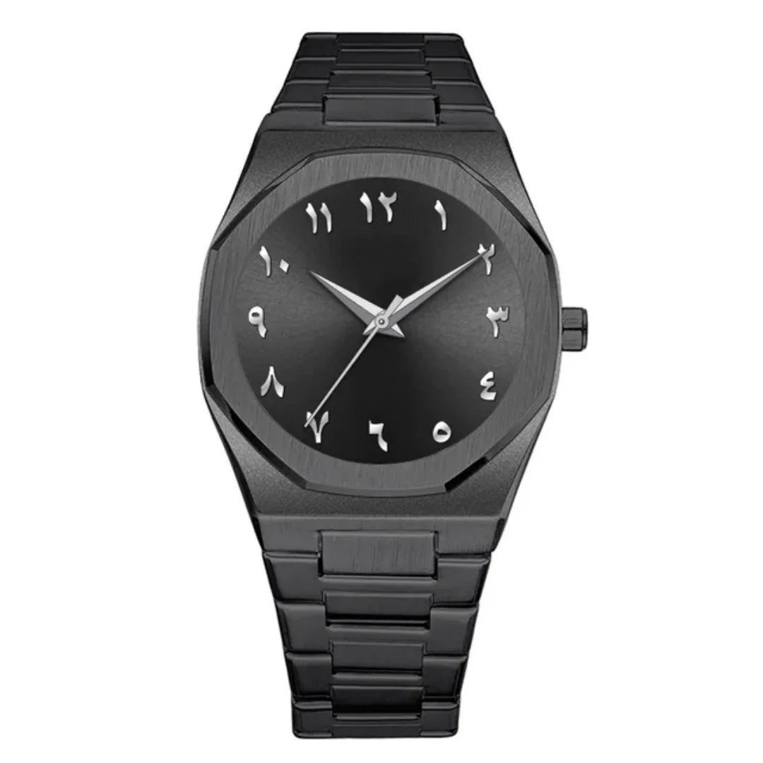 Introducing the Metallic Arabic Aura Watch, a masterpiece of elegance and cultural sophistication. Crafted with a sleek black stainless steel body, this timepiece features Arabic numeral hour markers that embody timeless heritage and modern design. Its minimalist black dial and brushed metal finish create a bold, refined look suitable for any occasion. Engineered for durability and comfort, this watch is perfect for those who value luxury, precision, and tradition. Elevate your style with the Metallic Arabic Aura — where modern craftsmanship meets Arabic artistry